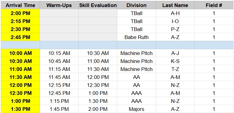Evaluations will consist of drills to assess fielding, hitting and pitching (Machine Pitch through Majors). Please have your players bring a glove, USA Certified bat, and batting helmet. Your player will receive a number once they complete the registration process and then placed into a group.
